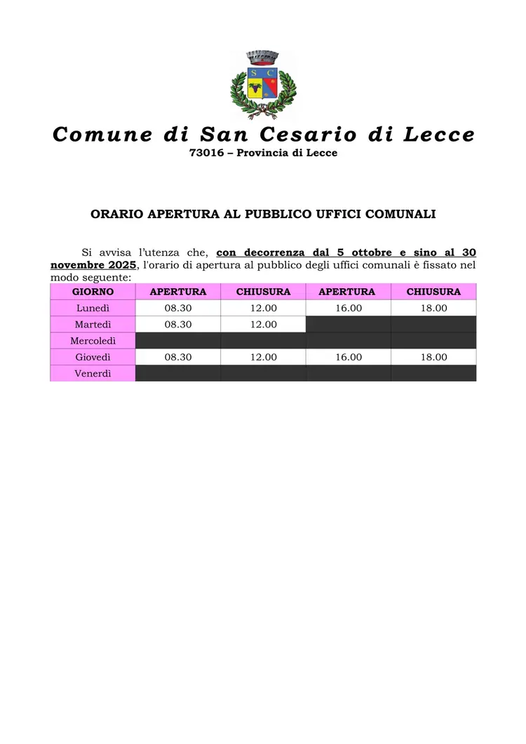 Si comunica che a partire dal 5 ottobre e sino al 30 novembre 2025 gli uffici comunali rispetteranno il seguente orario:Lunedì 8:30/12:00 – 16:00/18:00Martedì 8:30/12:00 Mercoledì chiusoGiovedì 8:30/12:00 – 16:00/18:00Venerdì chiusoNuovi orari di apertura al pubblico a partire dal 05/10/2025:• Matt